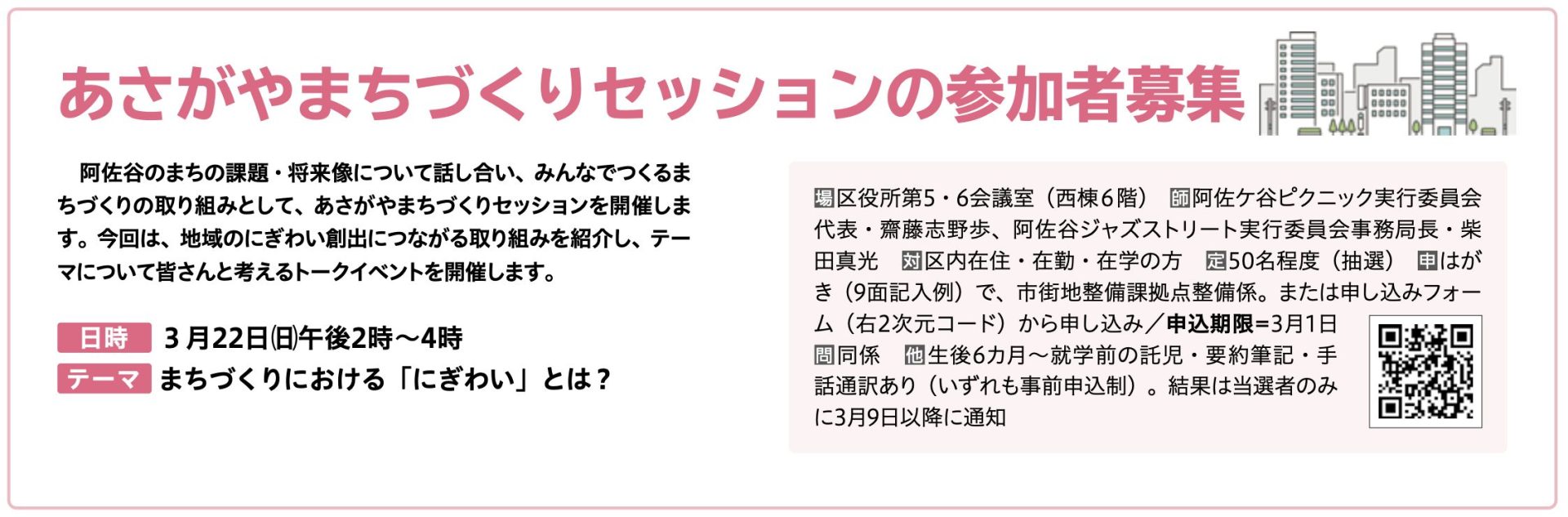 今後、阿佐谷というまちがどうなっていくのか。ハードの面の整備と並行して、ソフトの部分もボトムアップで声を届けていく貴重な機会となりますので、ご興味ある方はぜひご参加ください。