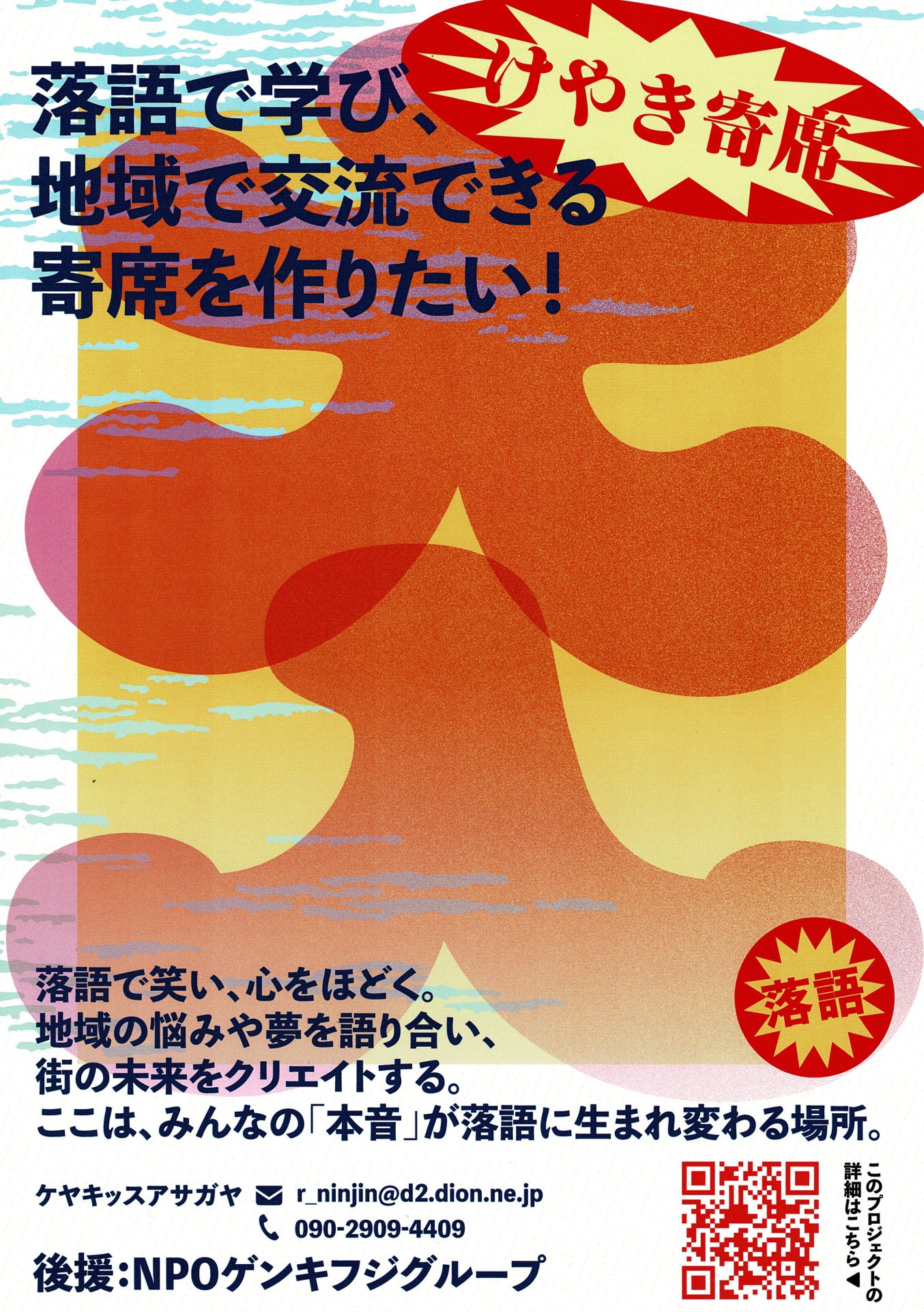 新たに「落語」の世界に関わらさせていただくこととなりました。「落語」そのものもしかりですが、寄席という同じ場で笑い合った和やかな空間を通じて、地域に新たな繋がり、現代の長屋というような関係を創出するプロジェクトです。「落語」を楽しんだあとは、懇親会を行い、「同じ釜の飯を食う」ようなフラットな関係性によって、地域社会の希薄化や独居高齢者の孤立などを防ぎ、質の高いコミュニティを築くことを目指します。