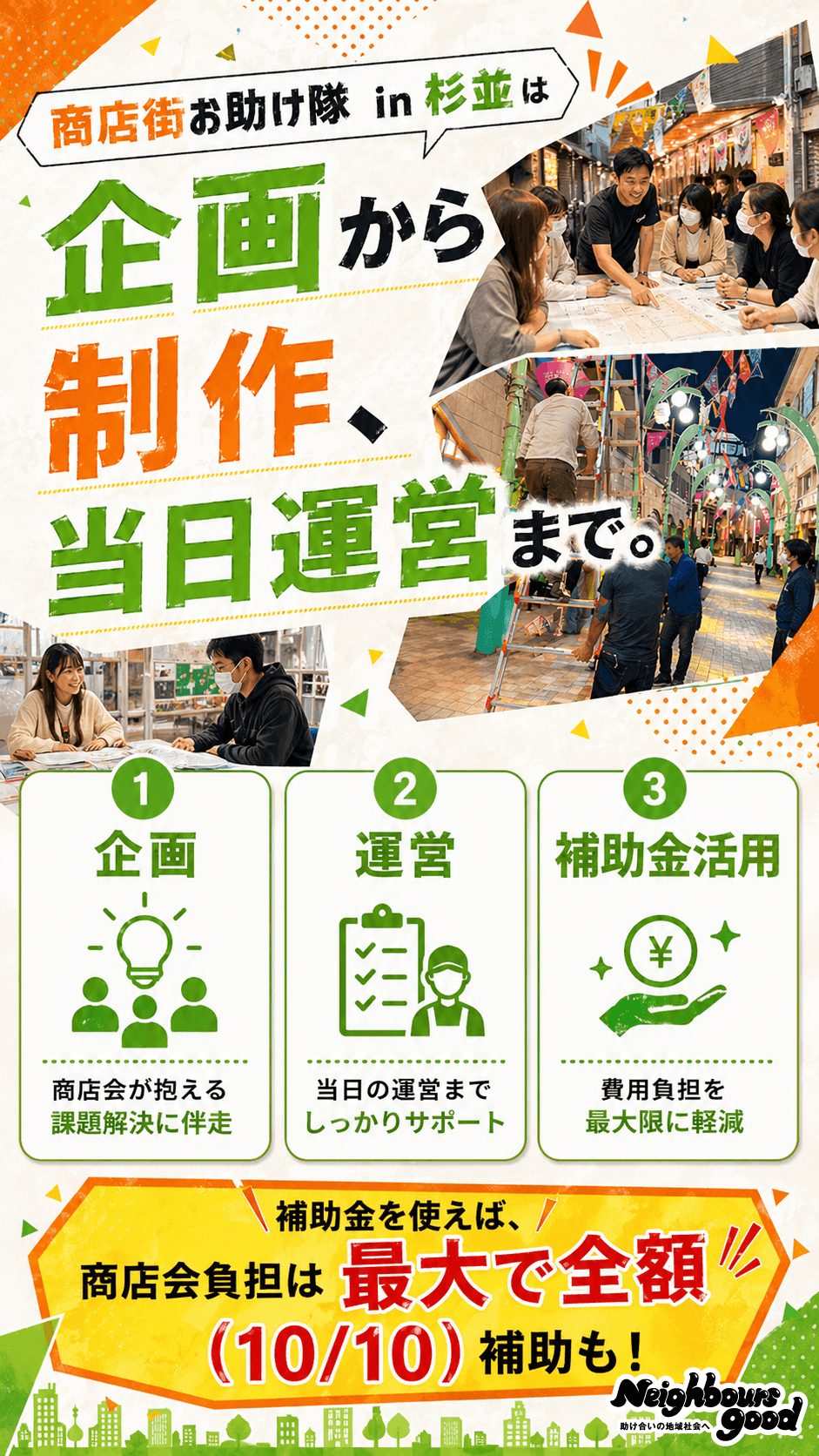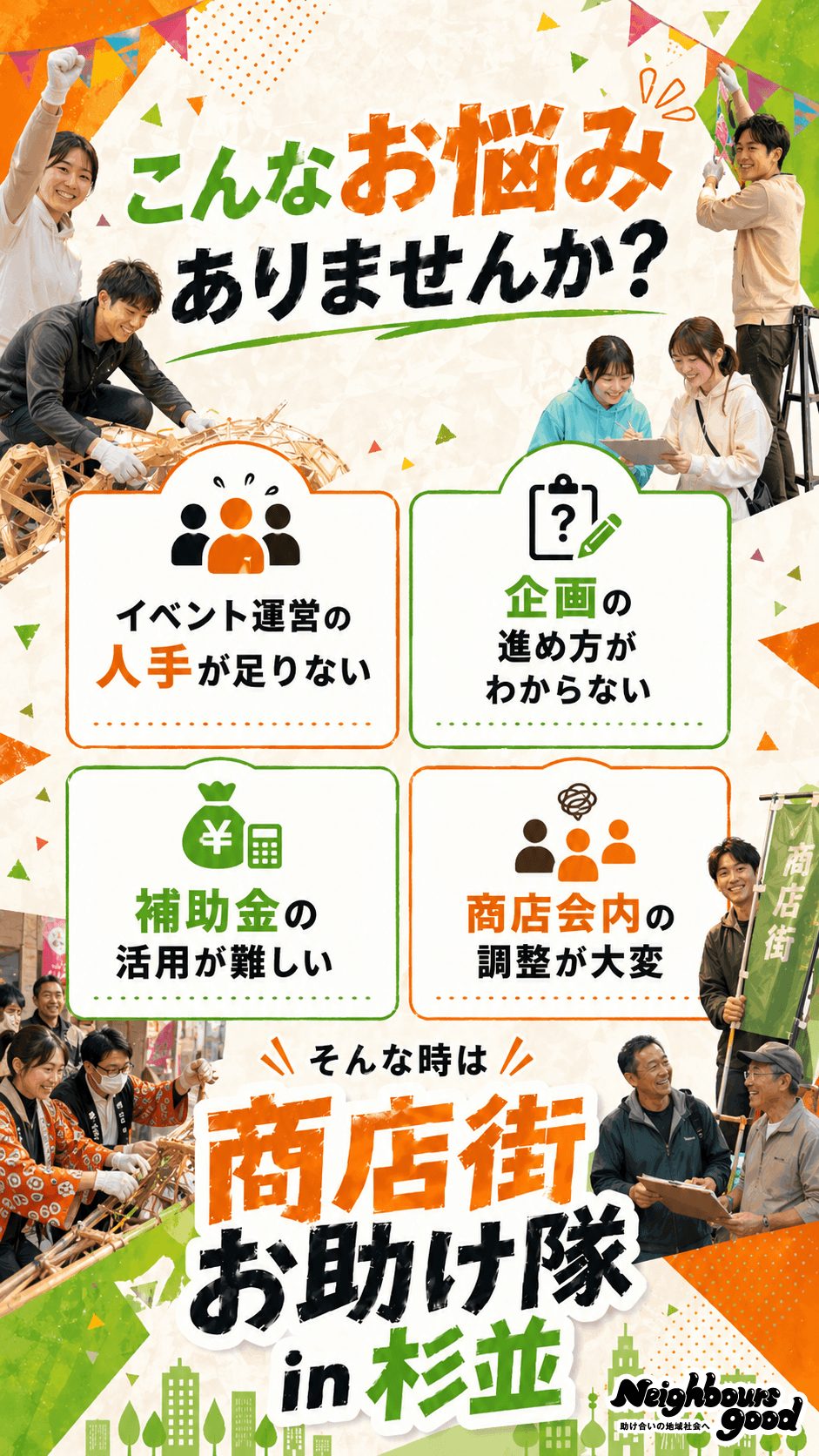 この度、当社は杉並区内の商店会の皆さまを対象に、企画づくりから補助金申請、ボランティア動員、当日運営までを一貫してお手伝いする実働支援サービス「商店街お助け隊 in 杉並」の提供を開始しました。