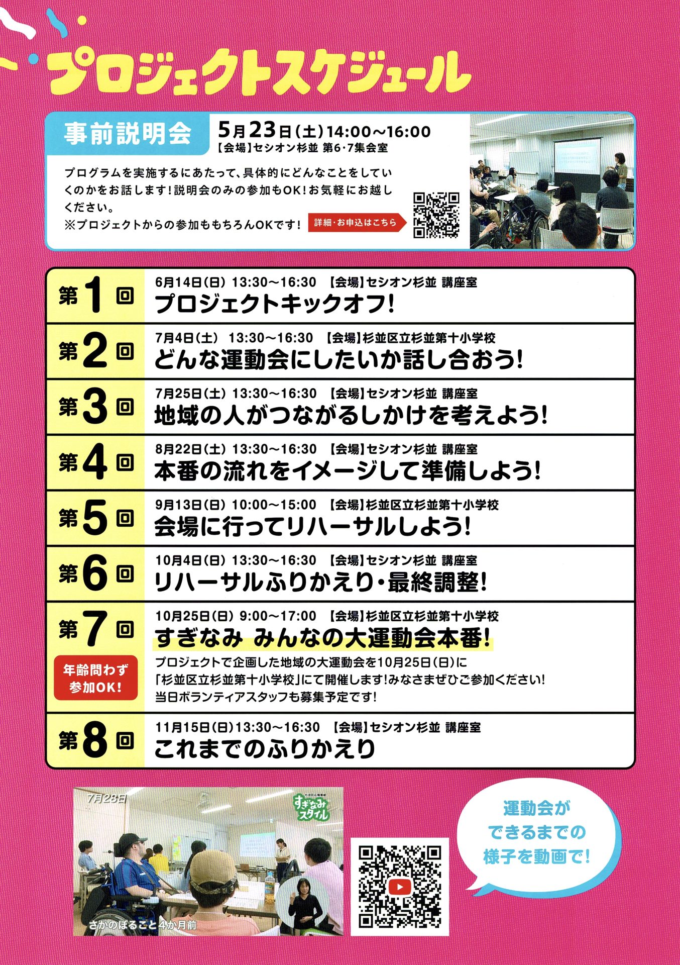第1回キックオフ(6/14)から始まり、企画・準備・リハーサルを経て、10月25日(日)の「すぎなみ みんなの大運動会」本番を迎えます。最終回(11/15)でふりかえりを行い、プロジェクトを締めくくります。